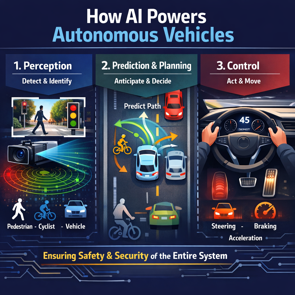 Ask someone how a self-driving car works, and you’ll usually hear something like, “AI drives the car.” That’s partly true—but the reality is a lot messier. The intelligence inside these systems is spread across several layers of software, each responsible for a different job. Think of it less like one brain and more like a chain of specialists passing information along.